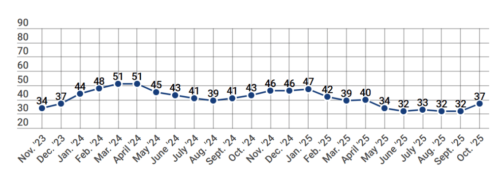 For October, the builder confidence score was 37, which is up five points since September and the highest it’s been since April. Current sales conditions also increased four points to 38. Sales expectations in the next six months jumped nine points to 54 and traffic of prospective buyers increased four points to 25.